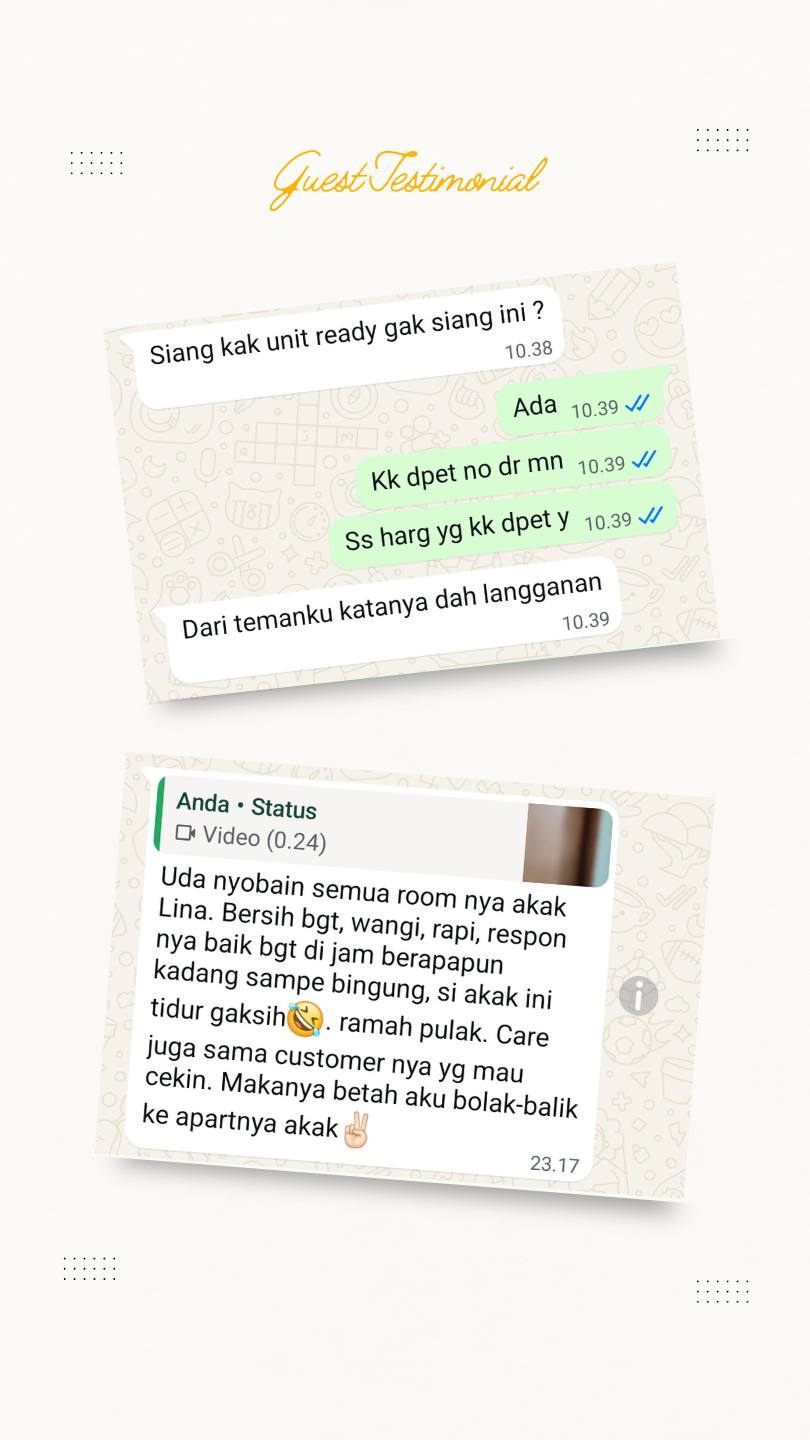 Lina Apartment merupakan agen resmi penyewaan apartemen harian di Margonda Residence 2. Dibuka dari tahun 2014, Lina Apartment sudah menghandel lebih dari 10.000 tamu yang mencari penginapan low budget namun dengan fasilitas yang lengkap.